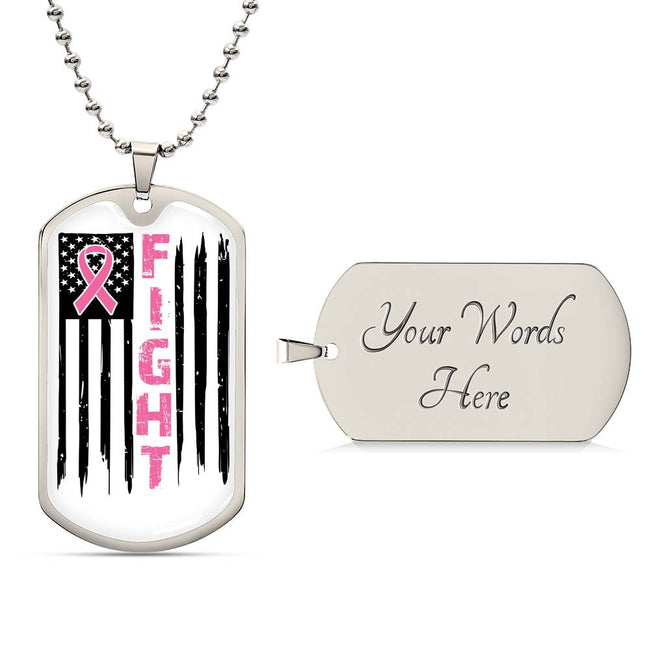 Show your loved one you believe in their fighting spirit by giving this Breast Cancer FIGHT Dog Tag necklace with ball chain. It is a unique gift showing your support of your loved one's FIGHTing spirit. Choose optional engraving and add a personal message on the back.